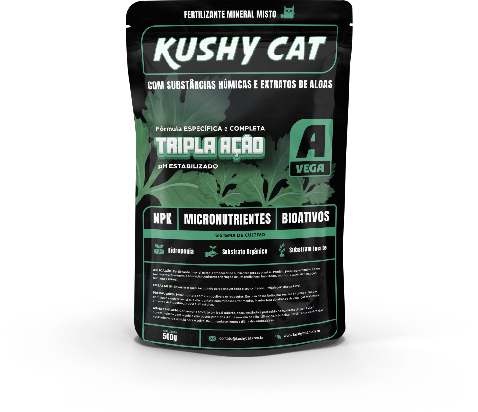 NPK, Micro nutrientes e Bioestimulação para Alta Performance em seu cultivo. A linha Kushy Cat com tecnologia Tripla Ação é a chave para maximizar o potencial genético da sua planta e alcançar colheitas excepcionais.